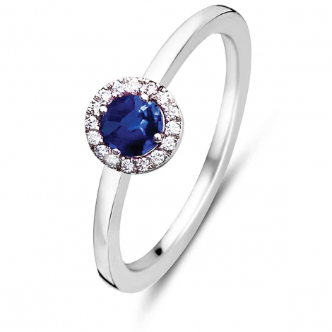 16 diamants d'un poids total de 0,08ct encerclent le saphir bleu.