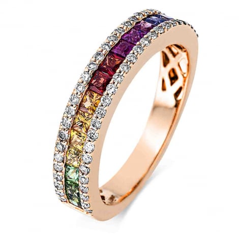 Cette bague est une véritable explosion de couleurs avec ses saphirs de couleurs façon rainbow, disposés avec soin dans un serti rail en or rose.