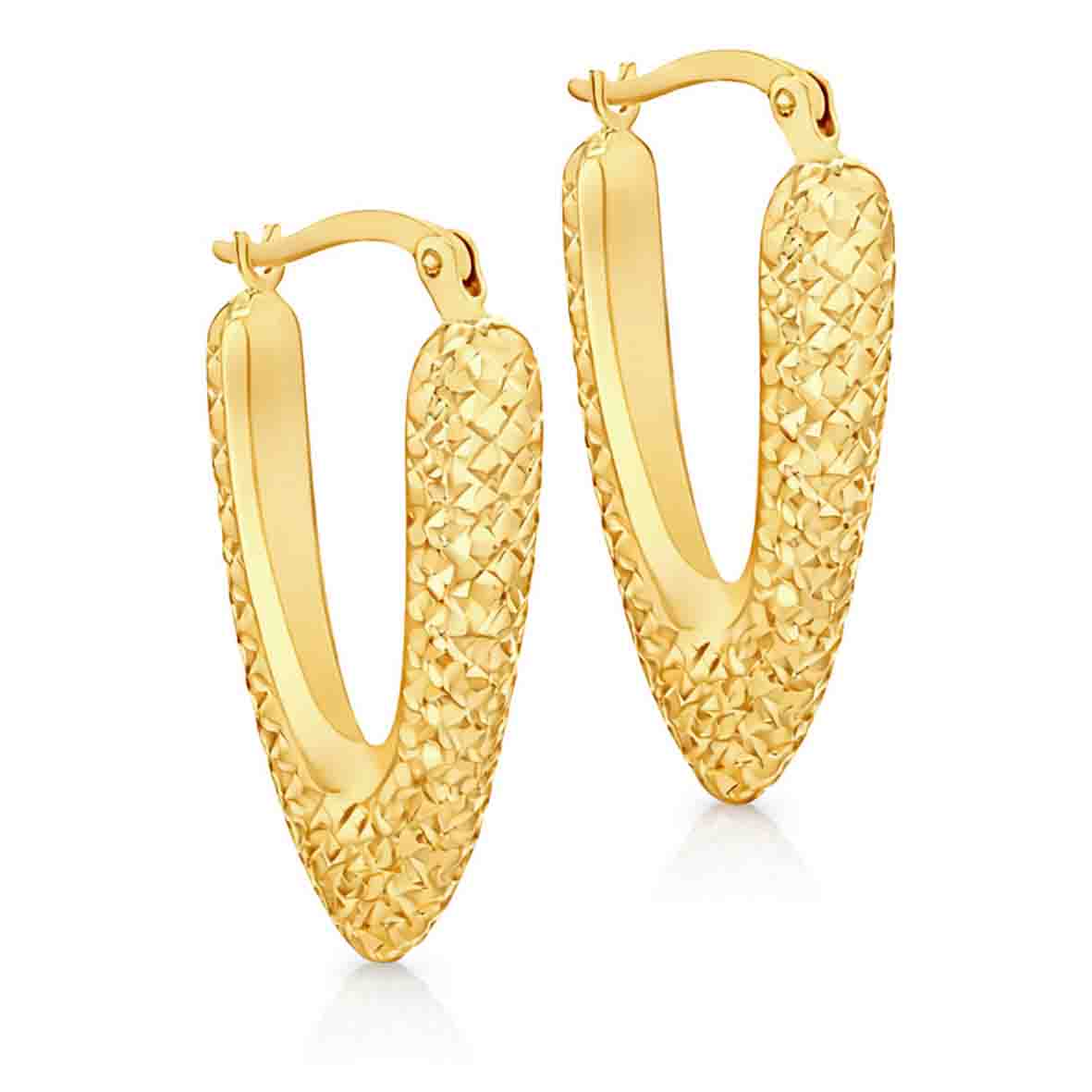 Découvrez l'élégance intemporelle de ces boucles d'oreilles créoles allongées en forme de V, confectionnées en or 9 carats jaune. Ces boucles d'oreilles haut de gamme incarnent la sophistication avec leur design épuré et leur finition diamantée qui capte la lumière avec grâce.