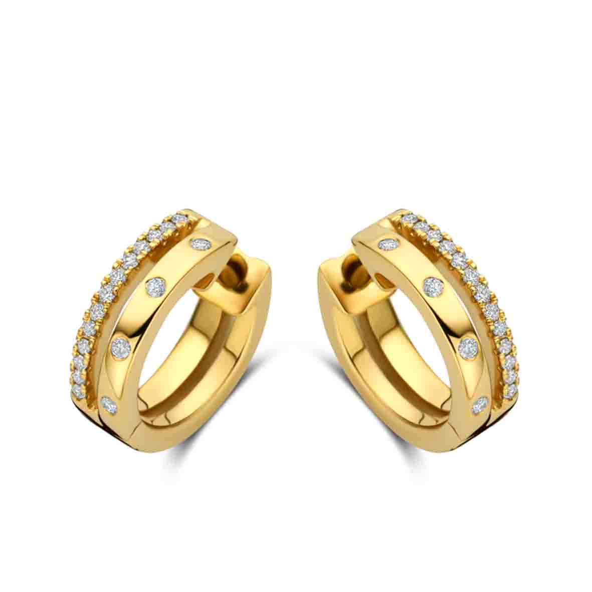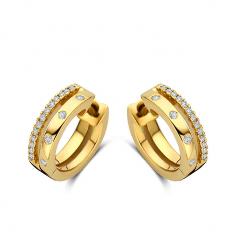 Réalisées en or 750/1000, elles offrent un éclat chaleureux sublimé par la brillance de 34 diamants taille brillant d’un poids total de 0.14 carat.