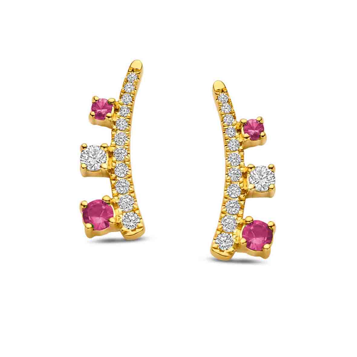 Ces boucles d’oreilles en or jaune 18 ct (750/1000) incarnent l’élégance et la douceur féminine à travers une combinaison raffinée de saphirs roses et de diamants naturels.