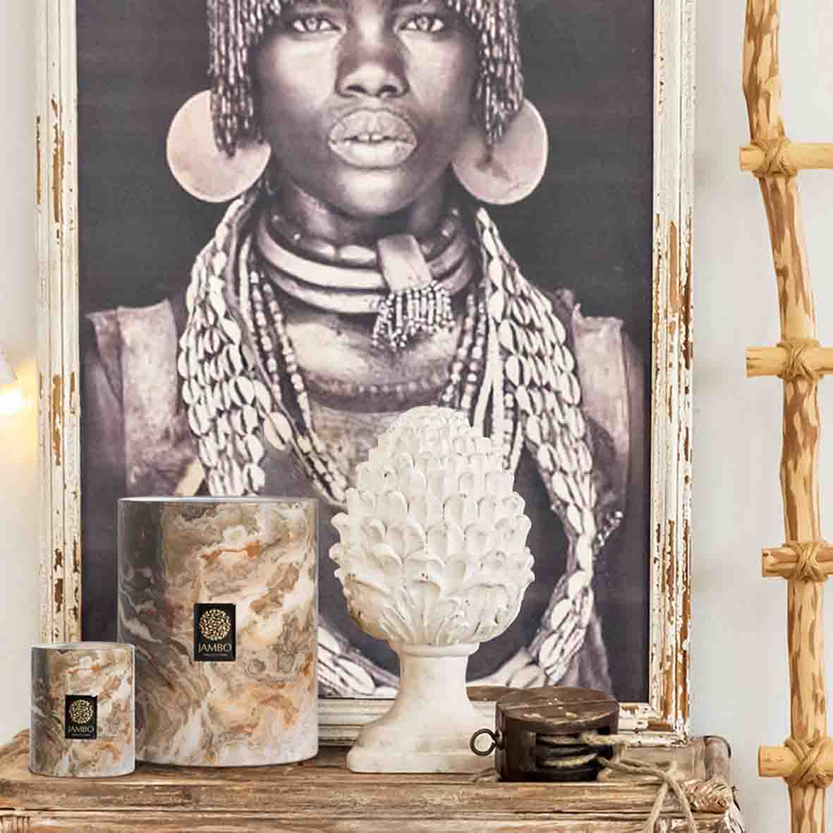 C'est une bougie parfumée de la Jambo Exclusivo Collection. Elle offre un parfum unique de Muscade, Cuir et Cacao, évoquant le désert. Son design luxueux en verre marbré et ses trois mèches en font un objet décoratif et une source d'ambiance raffinée.