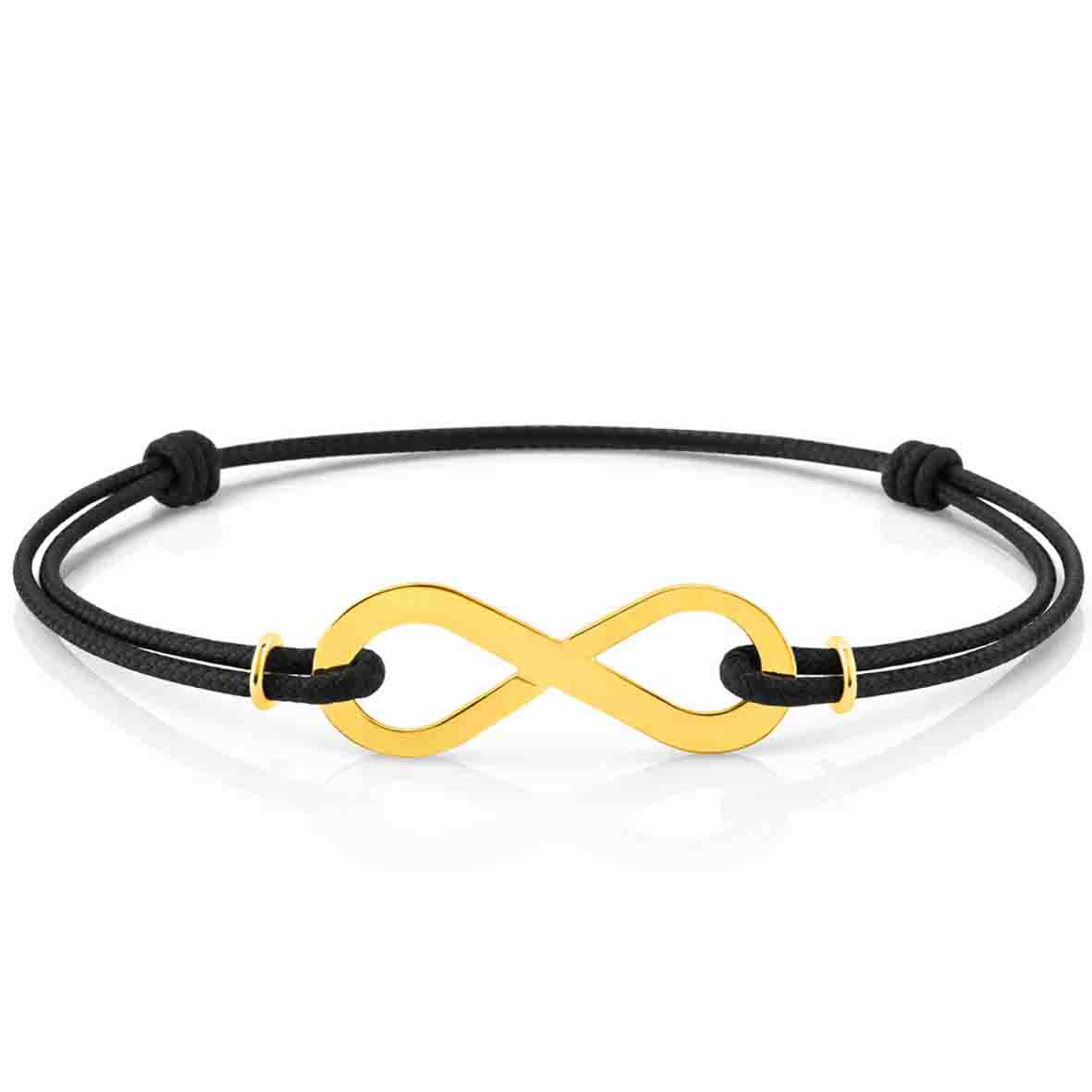 Le cœur de ce bracelet réside dans son emblématique signe de l'infini, minutieusement fabriqué en or jaune. Vous avez le choix entre deux degrés de pureté pour ce métal précieux : un or 9 carats (375/1000) pour une brillance éclatante à un prix accessible, ou un or 18 carats (750/1000) pour une intensité de couleur et une valeur accrues. Pesant 0,25 gramme et présentant une longueur de 20 mm pour son motif, cette délicate représentation du symbole est superbement mise en valeur par un cordon noir résistant et élégant.