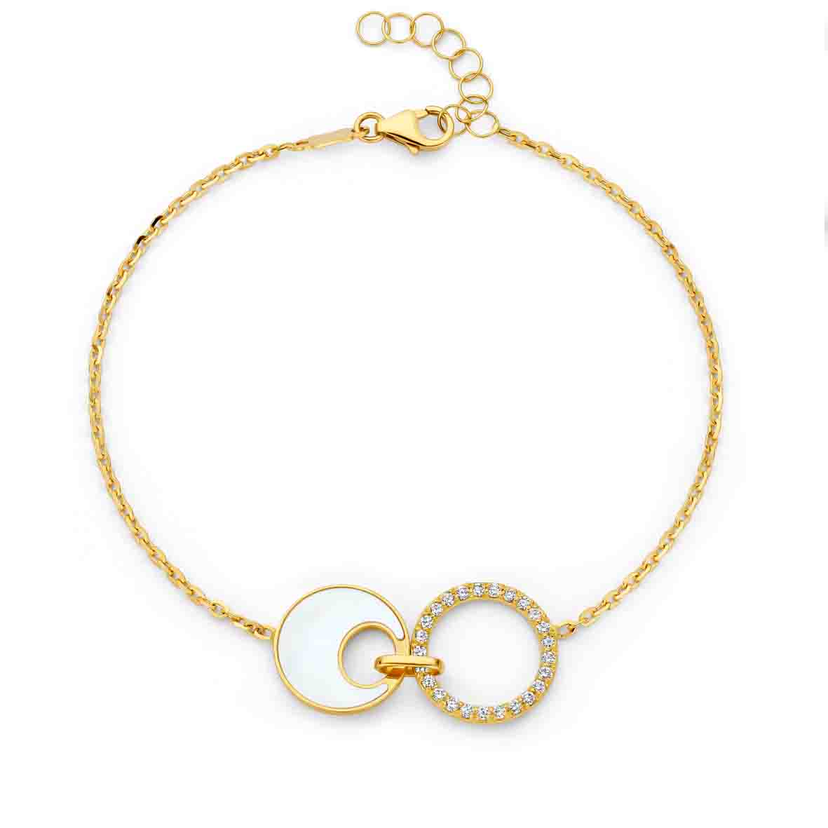 Élégant et intemporel, ce bracelet en or jaune 18 carats séduit par l’alliance harmonieuse entre la douceur nacrée et la brillance éclatante du diamant.