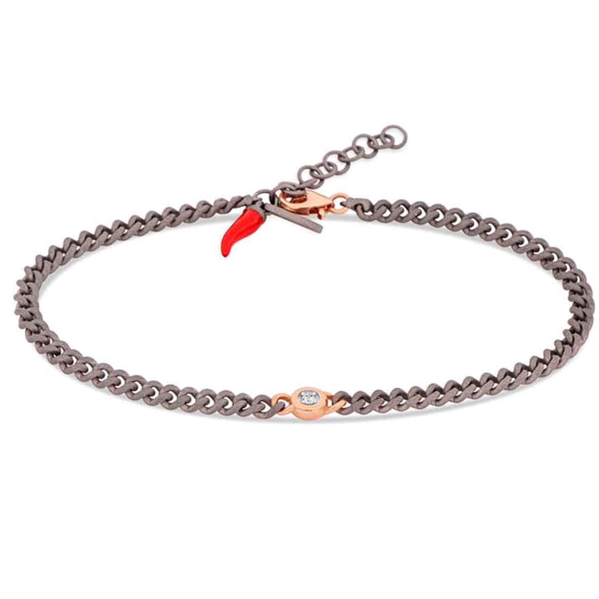 La chaîne gourmette en titane vient souligner le caractère masculin du bijou, tandis que le fermoir mousqueton en or rose 9K apporte une touche de préciosité et d’élégance.