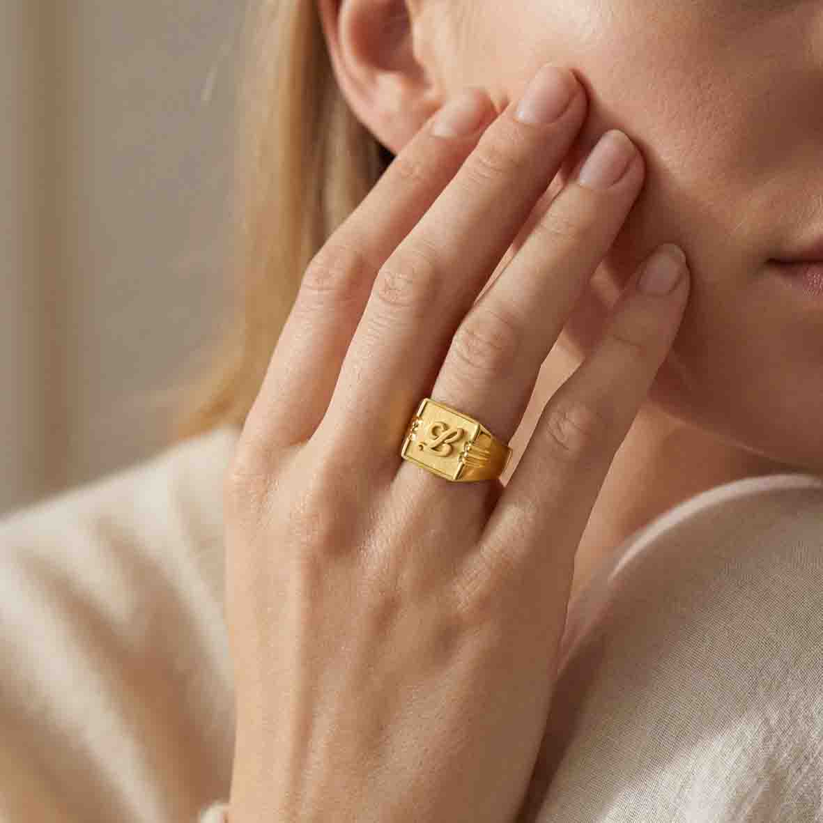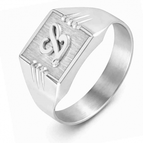Le design de ce modèle se distingue par un plateau supérieur de forme carrée, mesurant 9x9mm à sa base, idéal pour une personnalisation profonde. C'est sur cette surface que vous pouvez immortaliser votre héritage familial en y faisant graver des armoiries, ou simplement y apposer vos initiales, comme le sublime 'L' visible sur notre illustration. Ce détail transforme une simple bague en un véritable emblème personnel, porteur d'histoire et de sens. Les fins motifs gravés sur les épaules de l'anneau ajoutent une touche de sophistication supplémentaire, renforçant son caractère unique et son esthétique soignée.