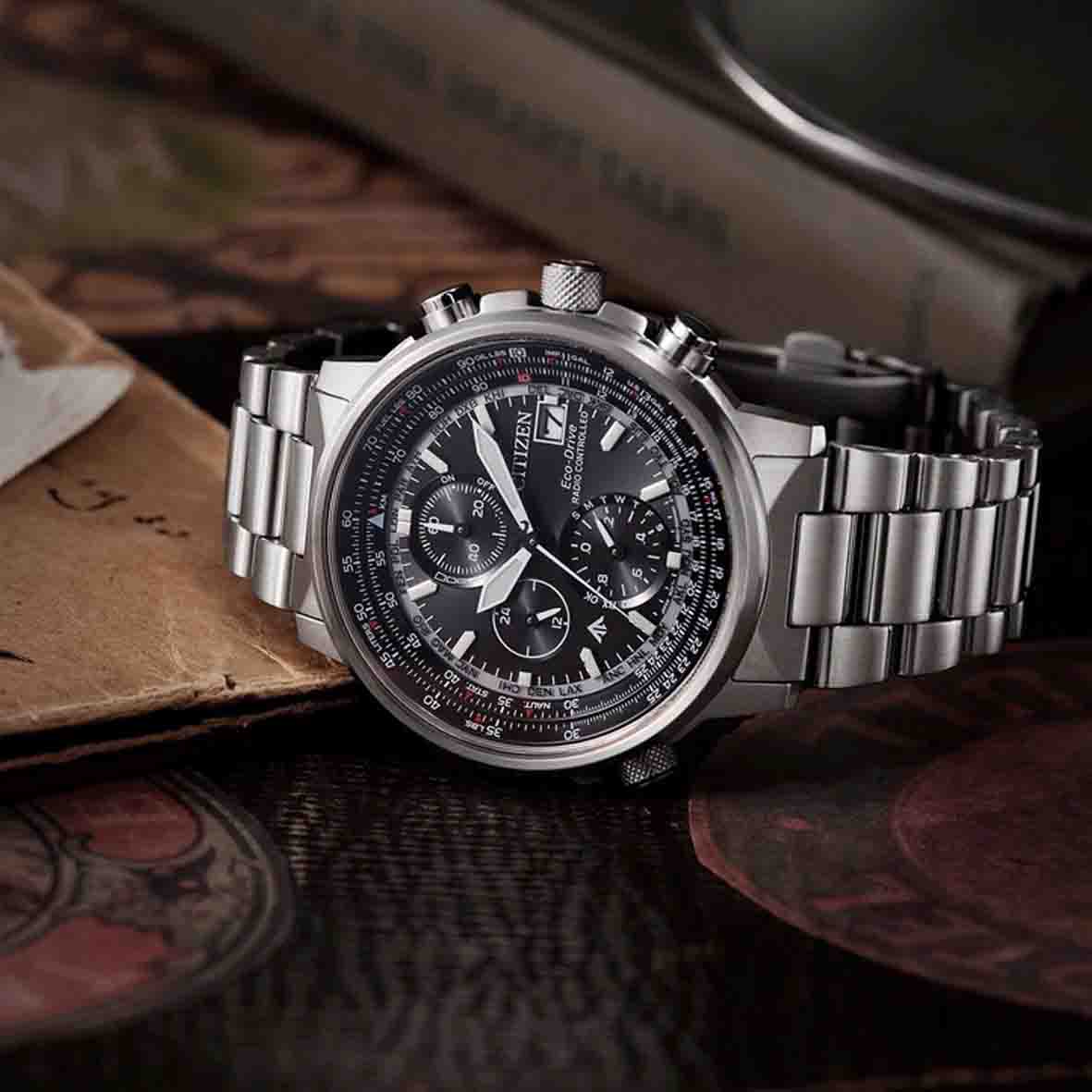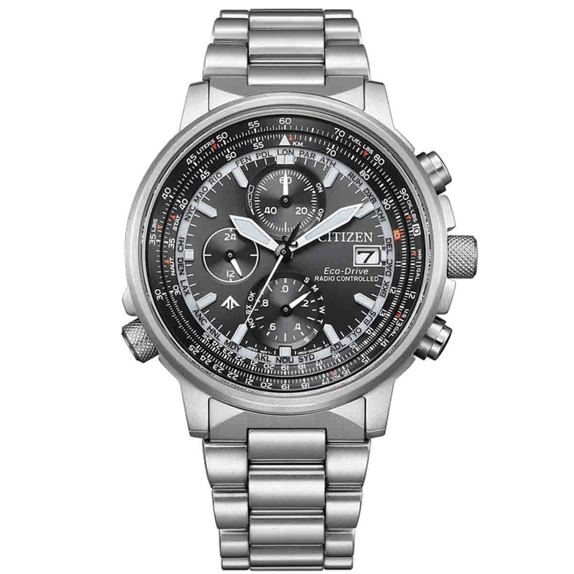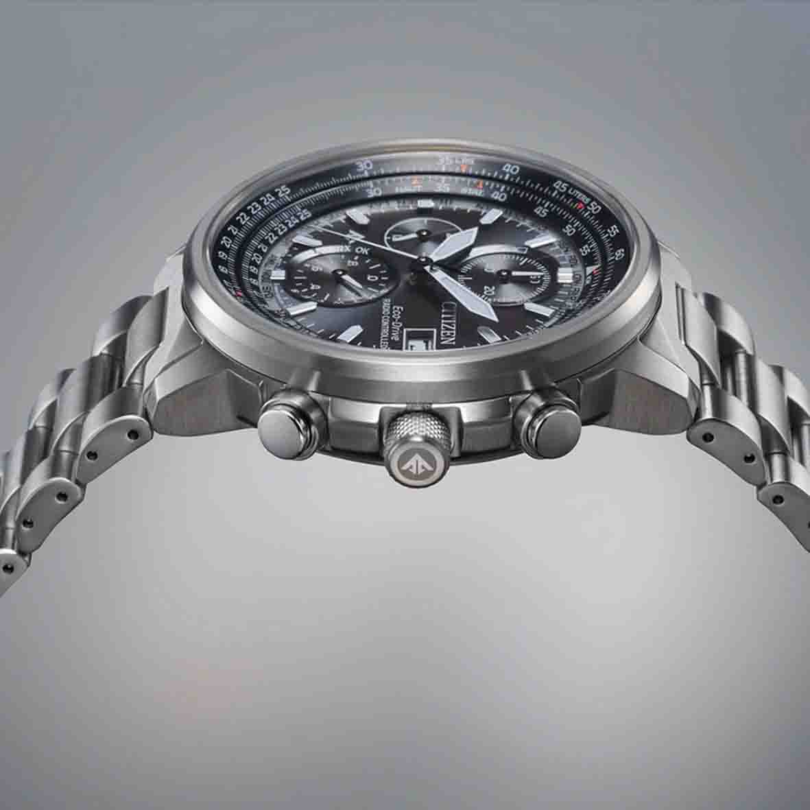 La Citizen Promaster Sky se synchronise automatiquement avec les signaux radio-contrôlés dans le monde entier (EUR, JPY, USA, Chine). Elle offre également les fuseaux horaires de 26 villes, ce qui la rend parfaite pour les voyageurs.