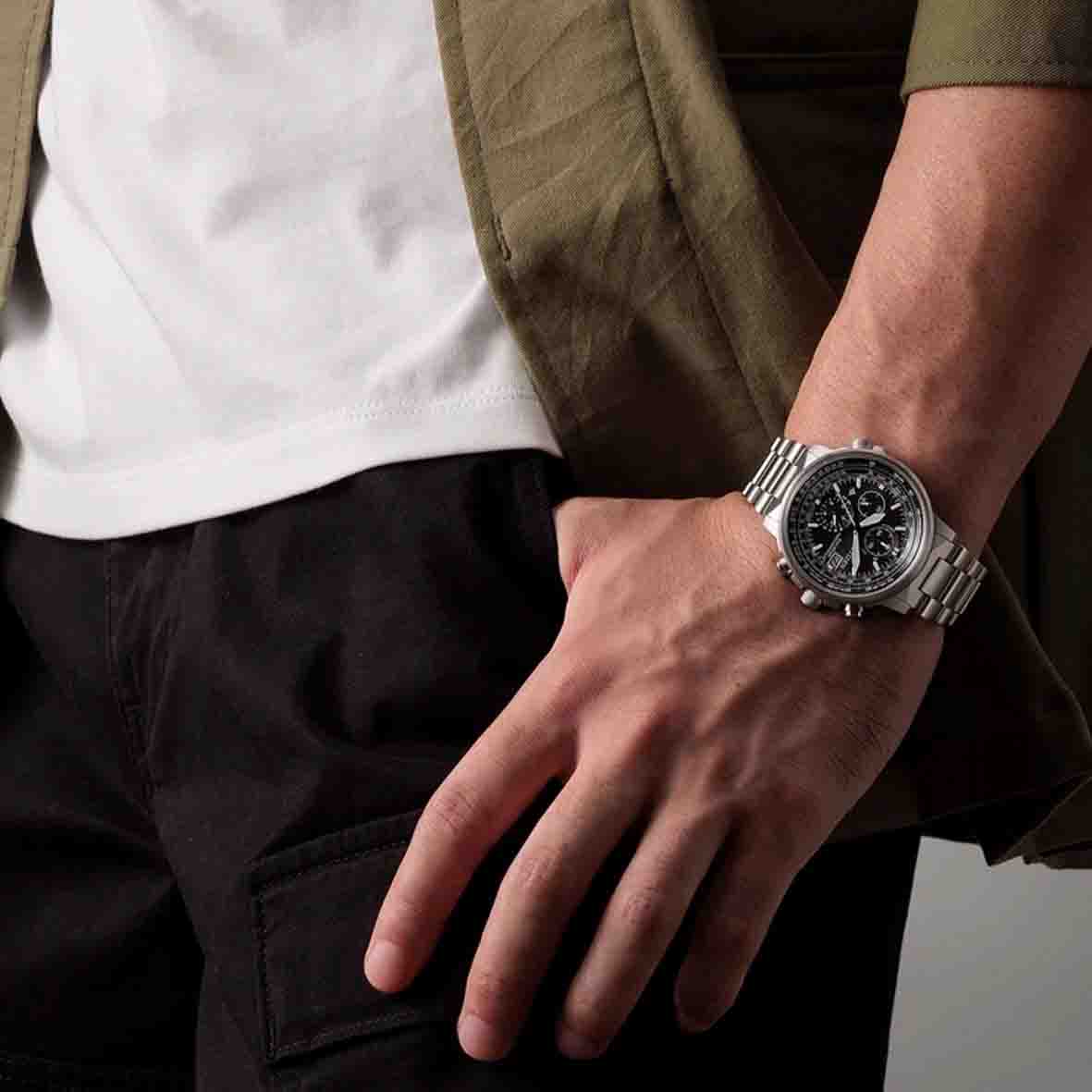Cette montre aviateur est équipée du calibre Eco-Drive H800, un mouvement de haute précision qui combine chronographe analogique et technologie radio-horloge. Elle offre une réserve de marche exceptionnelle de 180 jours.