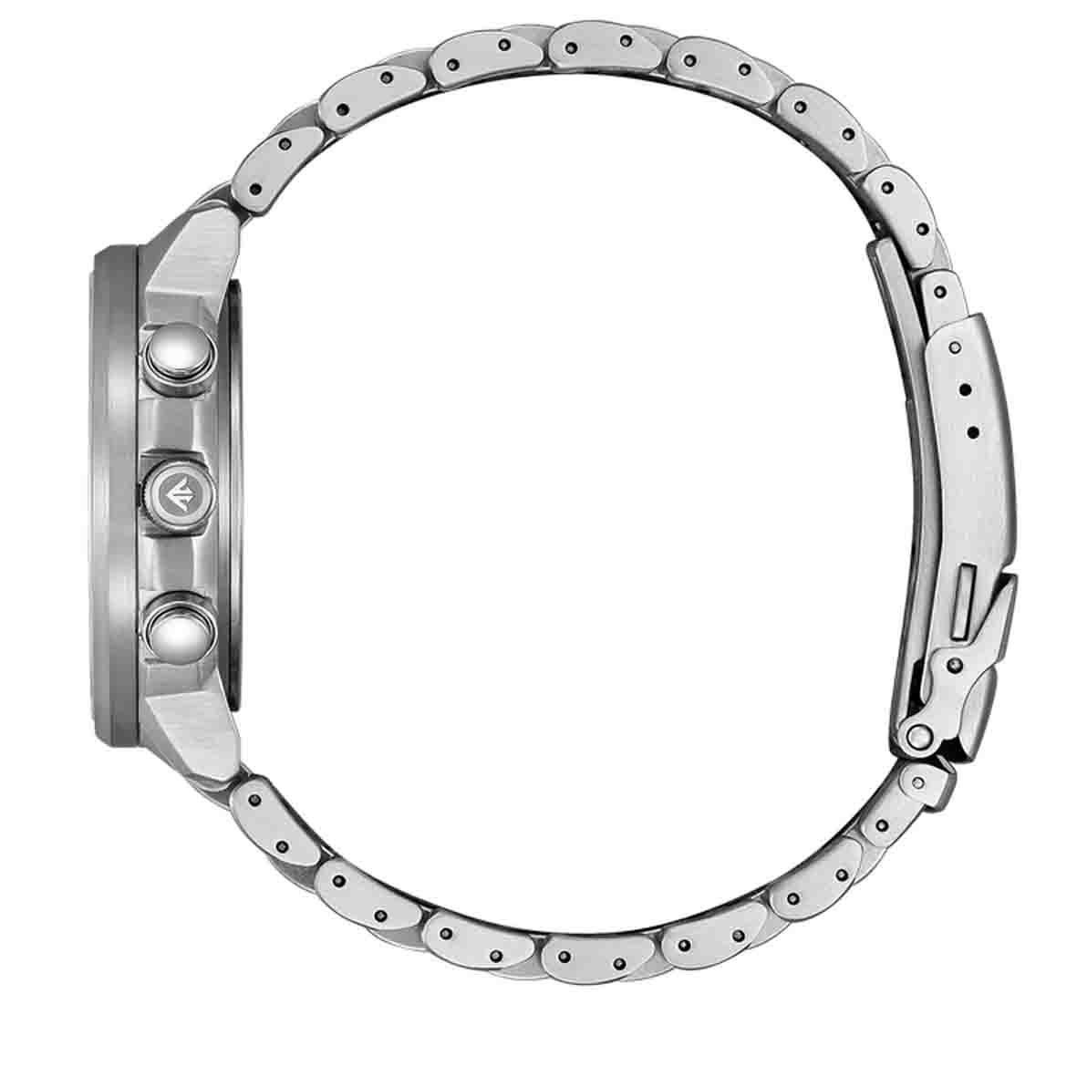 Le boîtier et le bracelet sont tous deux en acier inoxydable massif, ce qui garantit durabilité et résistance à la corrosion. Le bracelet est équipé d'une boucle déployante avec double fermoir poussoir sécurisé pour un port confortable et sûr.