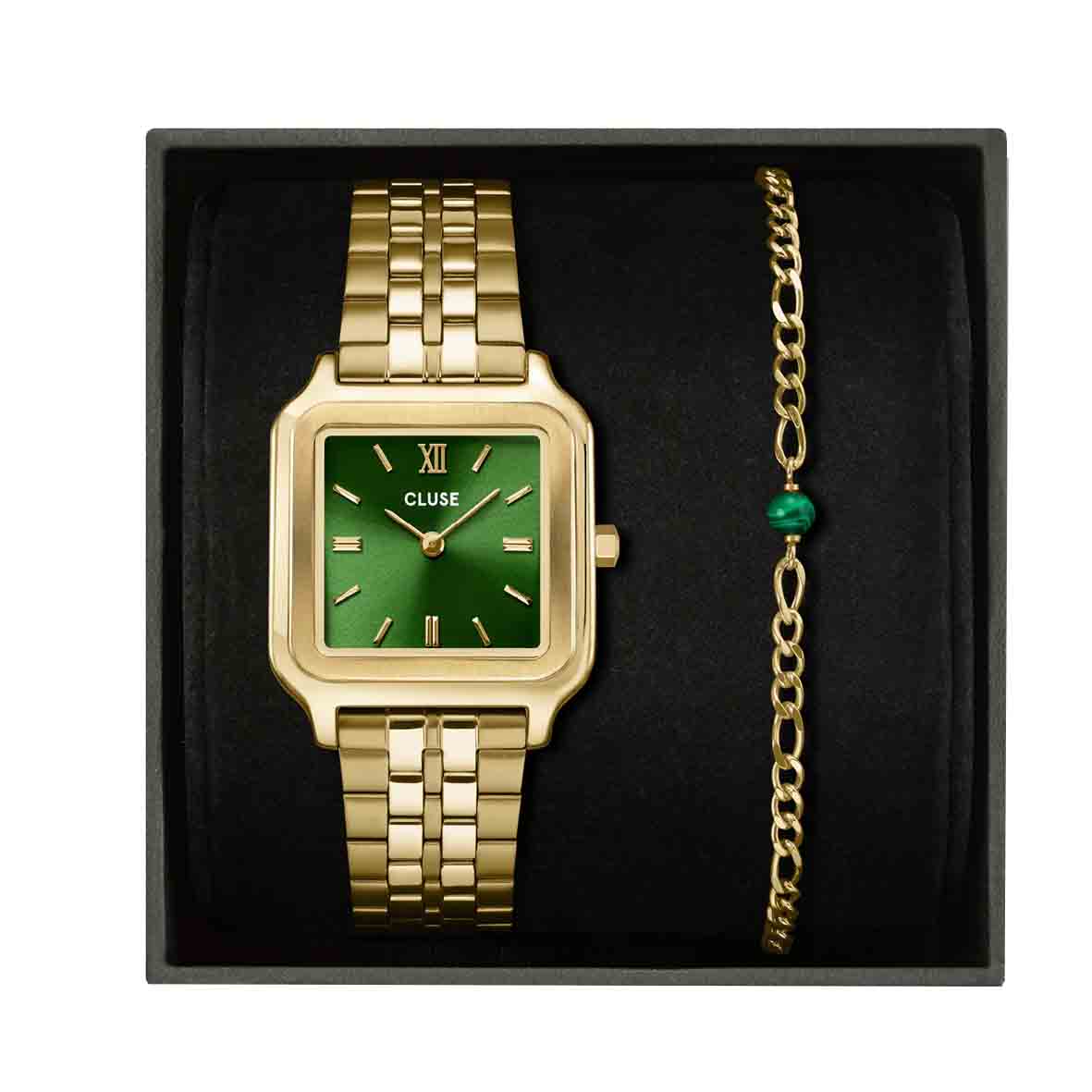 Coffret Cadeau CLUSE Gracieuse – Montre Acier Vert Forêt & Bracelet Malachite Doré