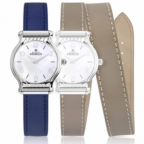 Le cadran nacré blanc a des Index et des chiffres arabes, le logo Michel Herbelin est positionné à 12 H