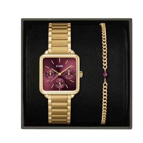 Coffret Cadeau CLUSE La Tétragone Multifonction – Montre Rouge Cerise & Bracelet Perles Doré