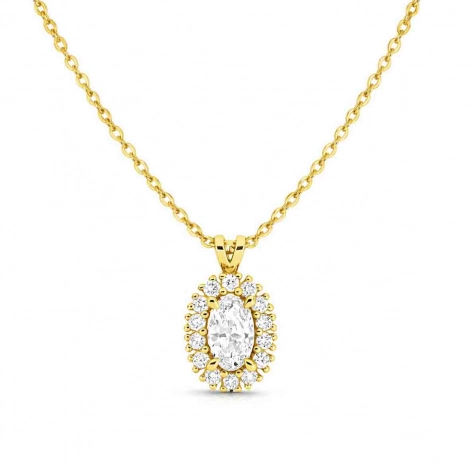 Ce collier diamant de synthèse combine un diamant central de forme ovale pesant 0.20 carat avec une couronne de diamants satellites totalisant 0.10 carat.