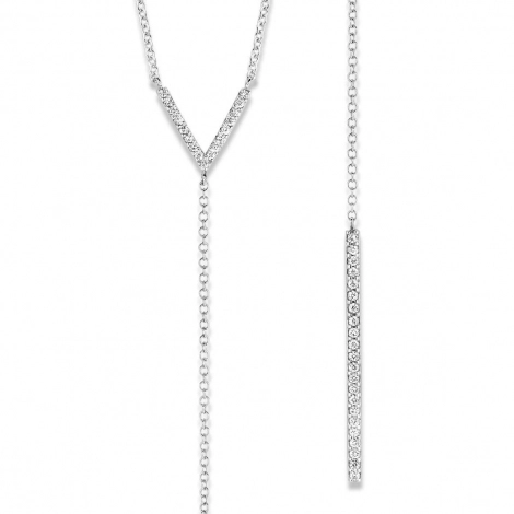 Le collier a 39 diamants pour un poids de 0.26 ct qui sont sertis sur une forme en "V" qui en son extrémité à une chaîne se finissant par une barrette sertie de diamants.