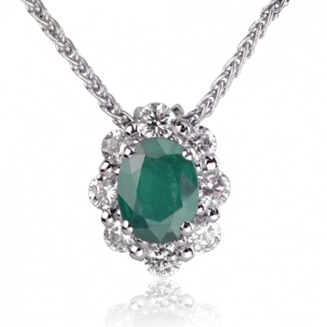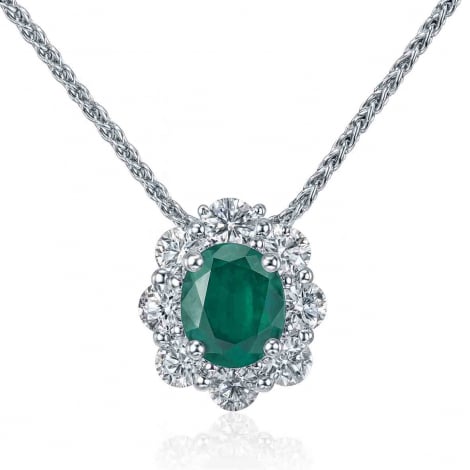 Son pendentif met en valeur une émeraude ovale d’un vert intense et lumineux, sertie sur quatre griffes rondes.