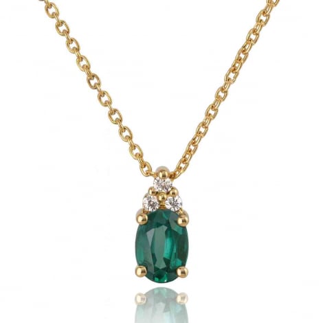 Le pendentif met en valeur une émeraude ovale de 0.50 carat, entourée de diamants scintillants totalisant 0.06 carat.