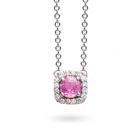 Le pendentif est en forme de coussin avec un saphir rose au milieu de diamants blancs.