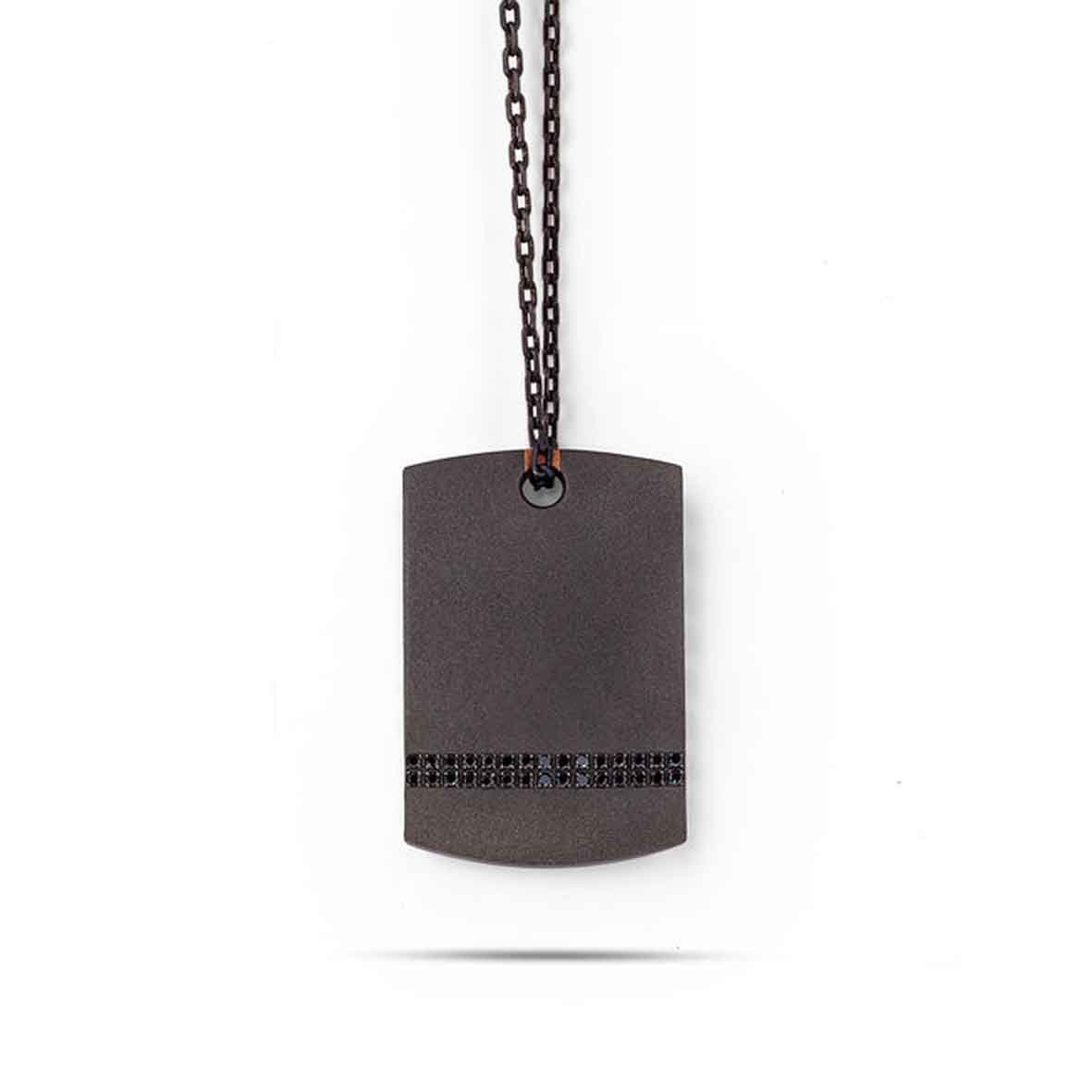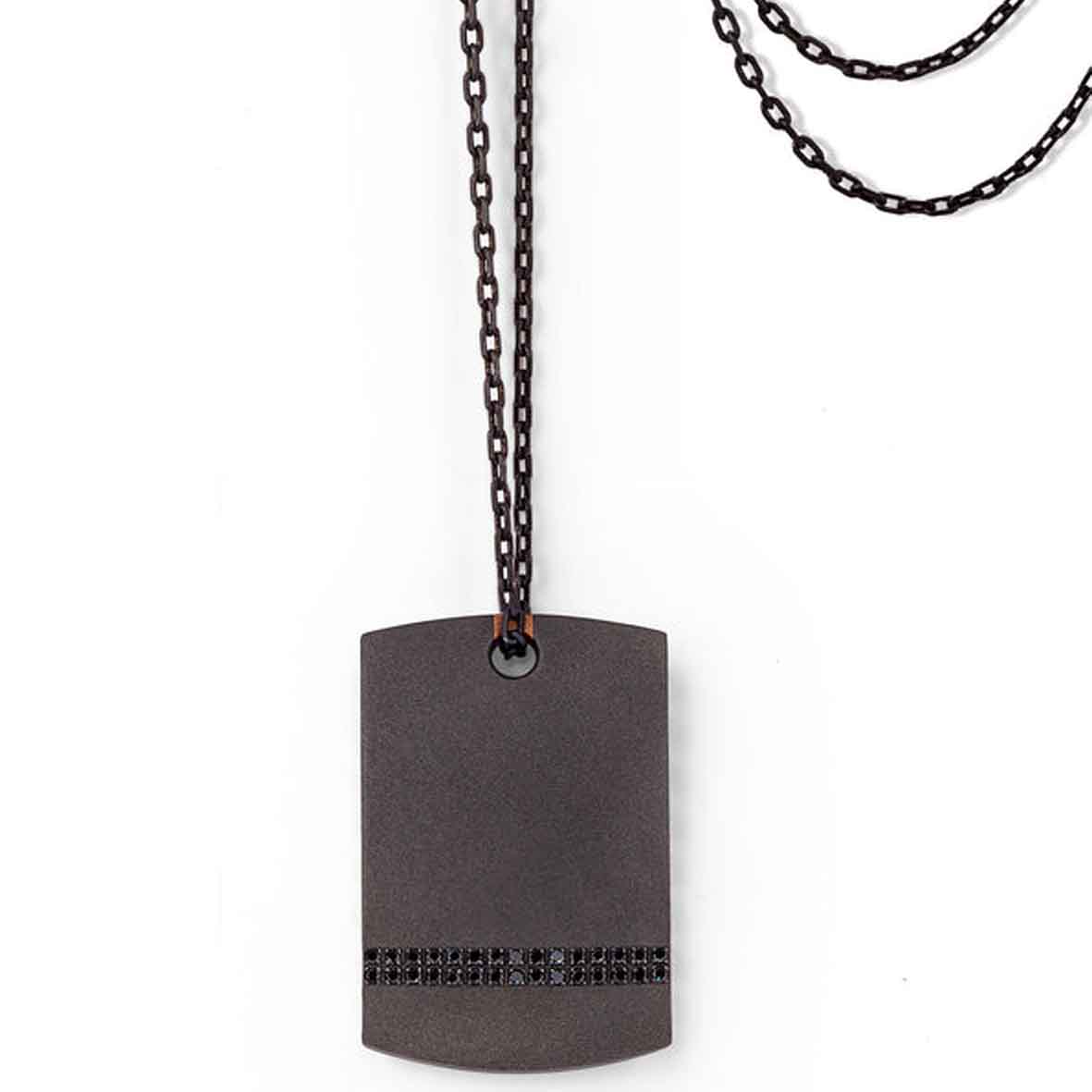 La plaque centrale en titane constitue le cœur du collier. Elle est ornée de 22 diamants noirs totalisant 0,22 carat, délicatement sertis pour refléter la lumière avec intensité.