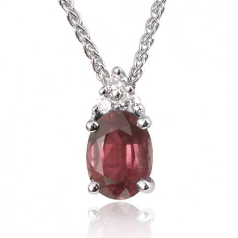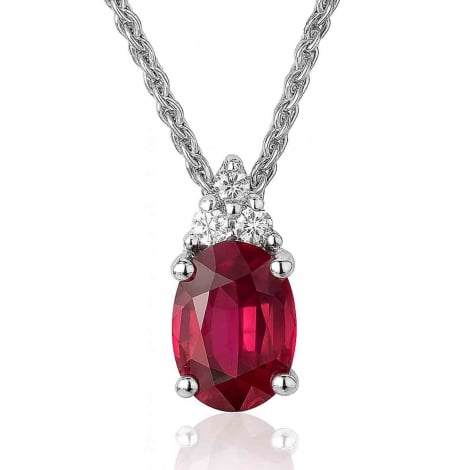 Son pendentif met en valeur un superbe rubis ovale d’un poids de 1.35 carat, d’un rouge éclatant et profond.