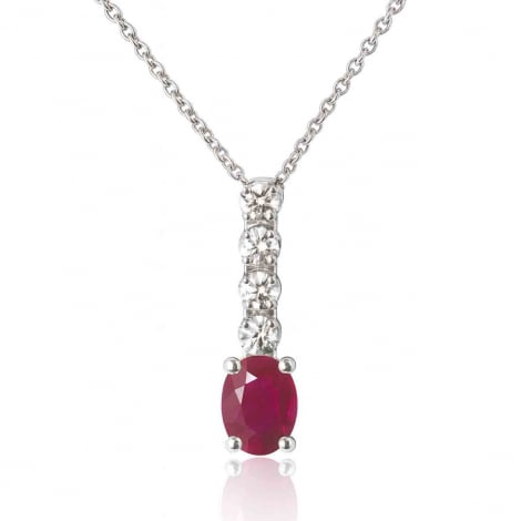 Le pendentif met en valeur un rubis ovale d’un poids de 1 carat, d’un rouge profond et lumineux.
