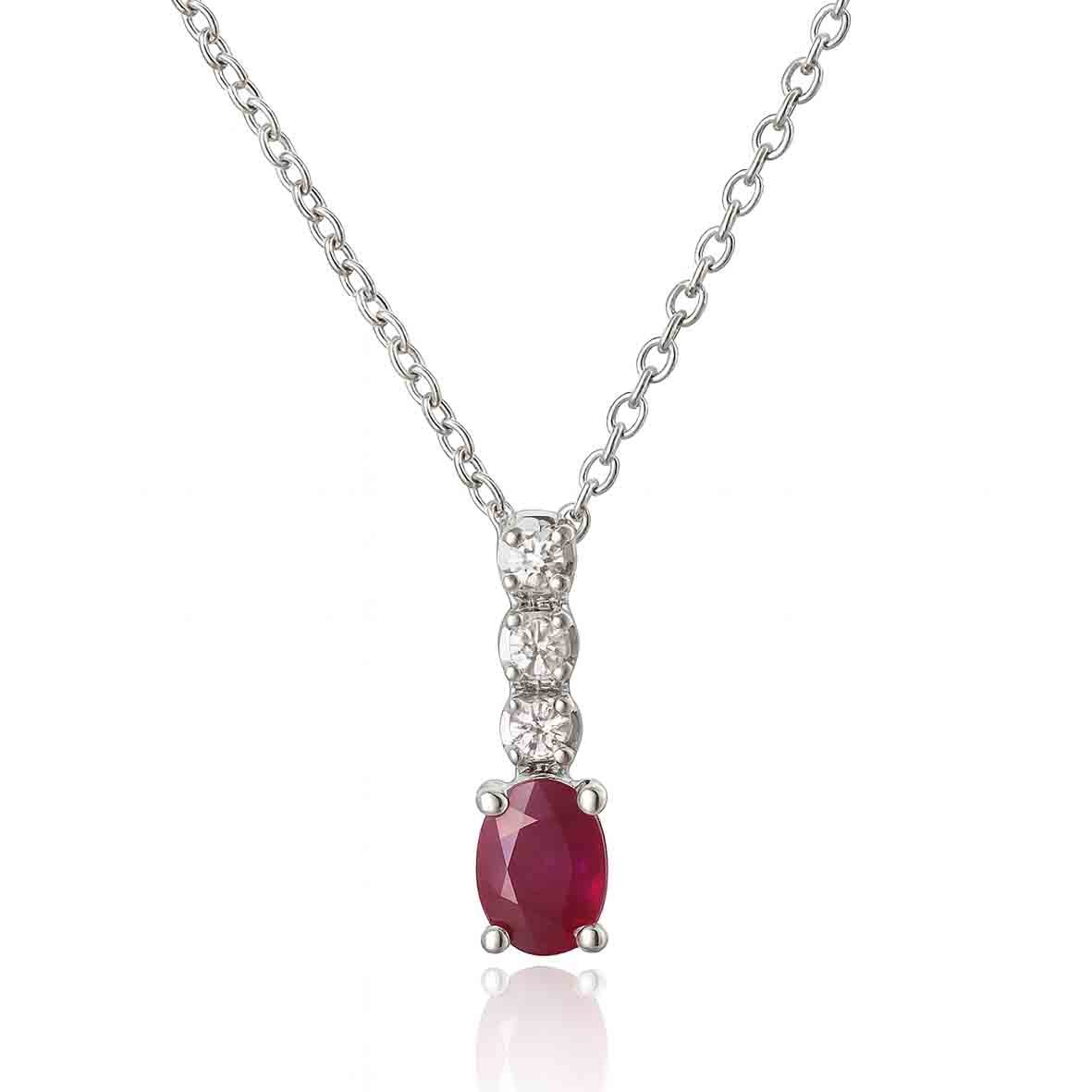 Le pendentif met en valeur un rubis ovale de 0.60 carat, d’un rouge profond et lumineux.