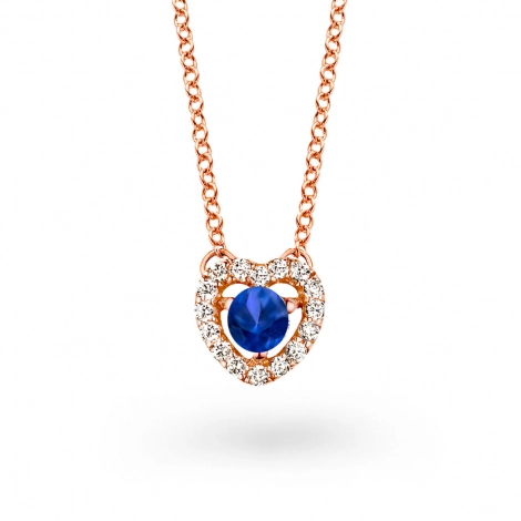 Le collier cœur est serti d'un saphir de centre entourée de 14 diamants blancs.