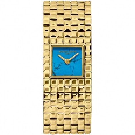 La Frédérique Constant Classics Manchette incarne une fusion audacieuse entre l'horlogerie suisse de précision et la joaillerie haut de gamme. Dotée d'un cadran en véritable turquoise et d'un boîtier en acier avec placage PVD or jaune, cette montre femme captive par son élégance minérale et sa présence lumineuse. Le motif Clou de Paris gravé sur l'ensemble de la pièce crée une architecture sculptée qui joue avec la lumière à chaque mouvement du poignet.