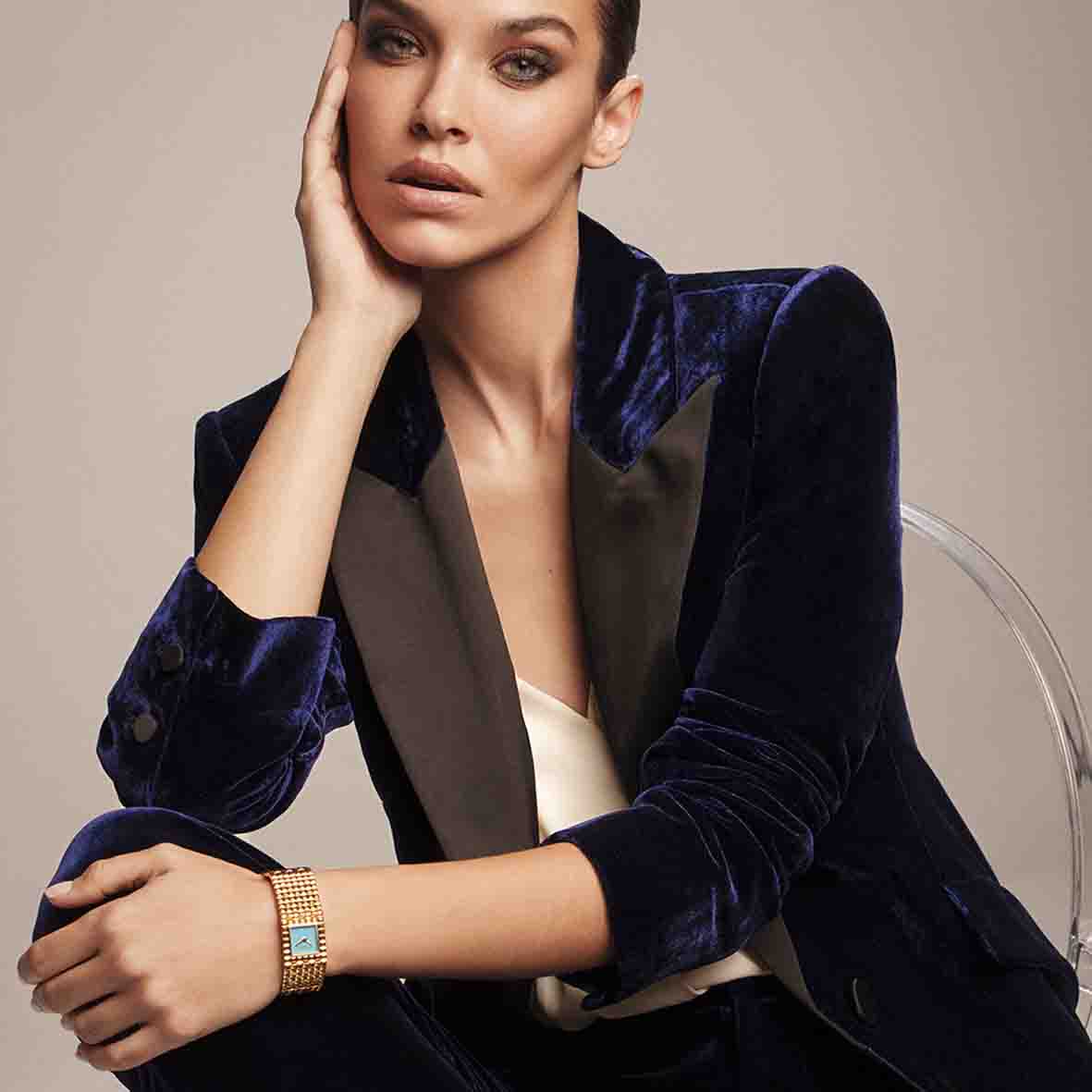 Cette montre classique rectangulaire conjugue l'héritage des années 1980 avec une modernité brillante. Son bracelet manchette à sept maillons facettés épouse le poignet comme une seconde peau, offrant un confort optimal du jour à la nuit grâce à sa fermoir déployante dissimulé.