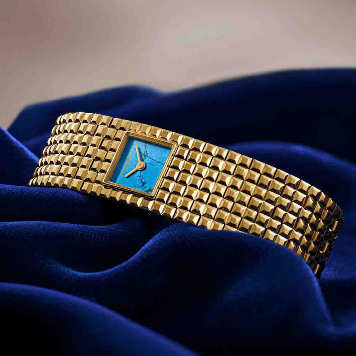 Le cadran est en véritable turquoise, une pierre minérale unique et noble qui offre une teinte bleu azur spectaculaire contrastant avec les aiguilles dorées.