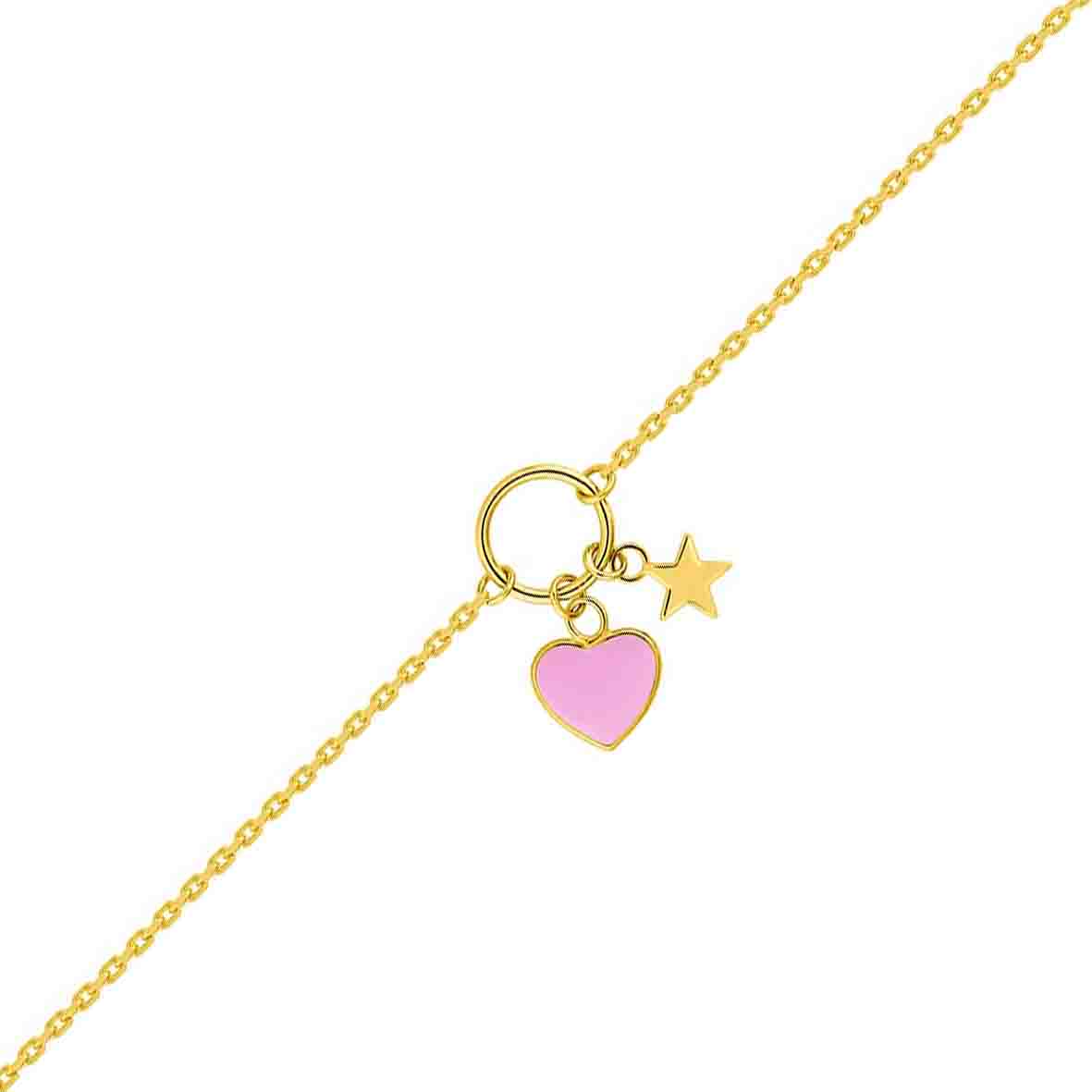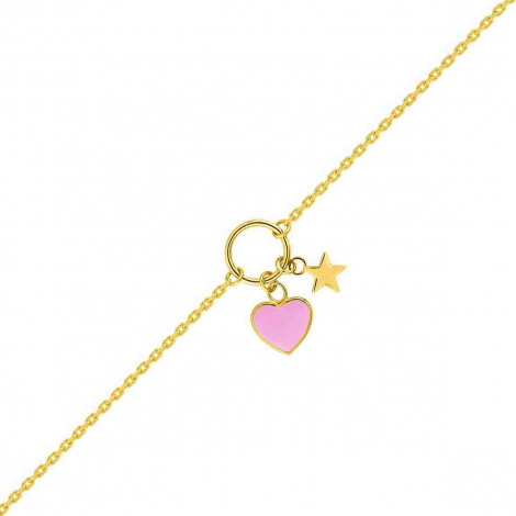 La chaîne du bracelet est constituée d'une maille forçat d'un coeur rose et d'une étoile au centre.