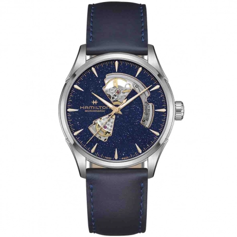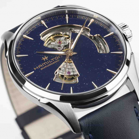 Avec sa réserve de marche de 80 heures et son spiral en Nivachron™, la Jazzmaster Open Heart Auto est montée sur un bracelet en cuir bleu raffiné.