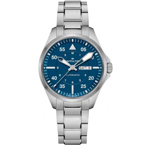 La Khaki Aviation Day Date 42 mm est équipée d'un bracelet en acier inoxydable au style décontracté et d'un cadran bleu intense qui évoque les possibilités infinies d’un ciel dégagé.