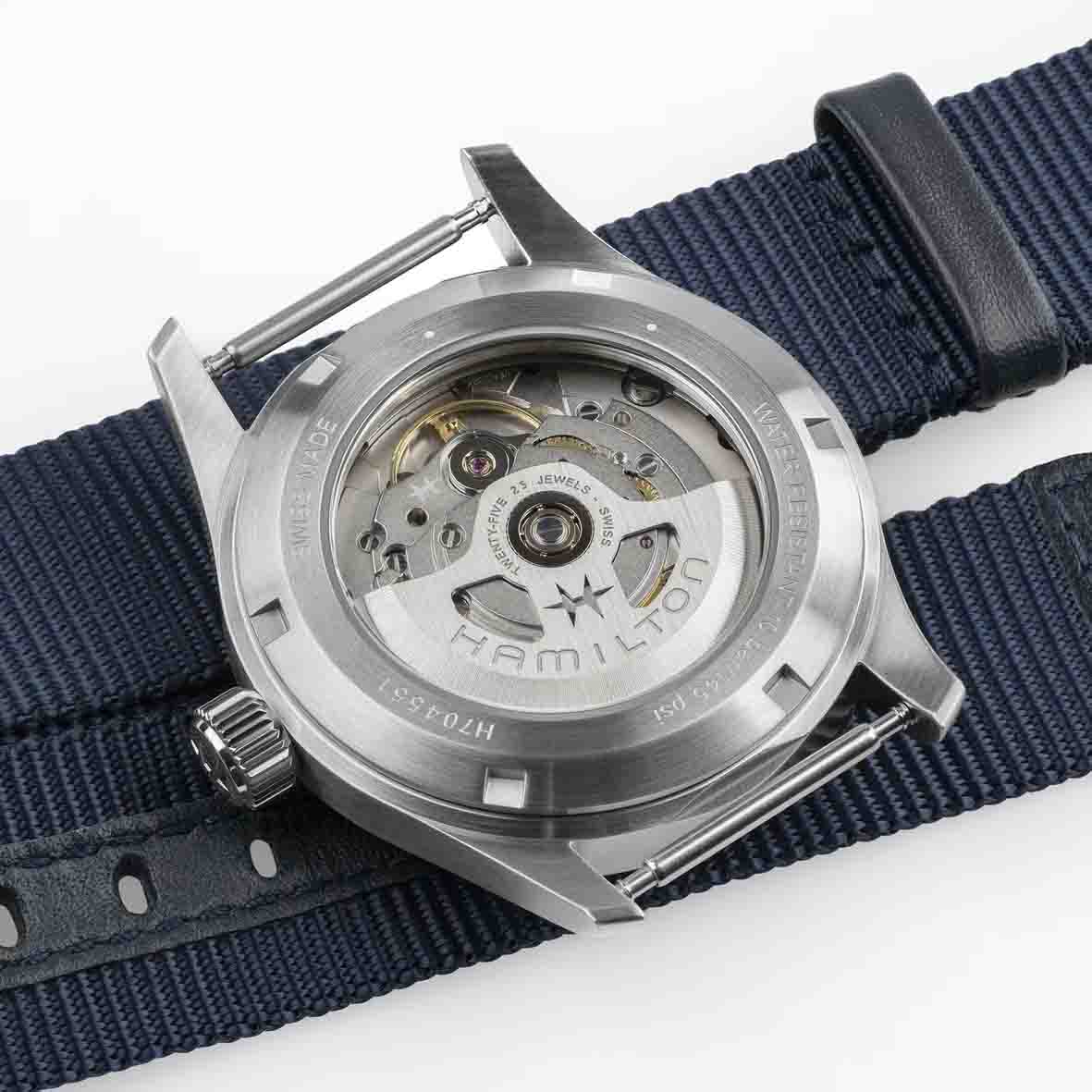 Coeur battant de cette montre de caractère, le mouvement automatique H-10 développé par Hamilton assure une réserve de marche impressionnante de 80 heures.