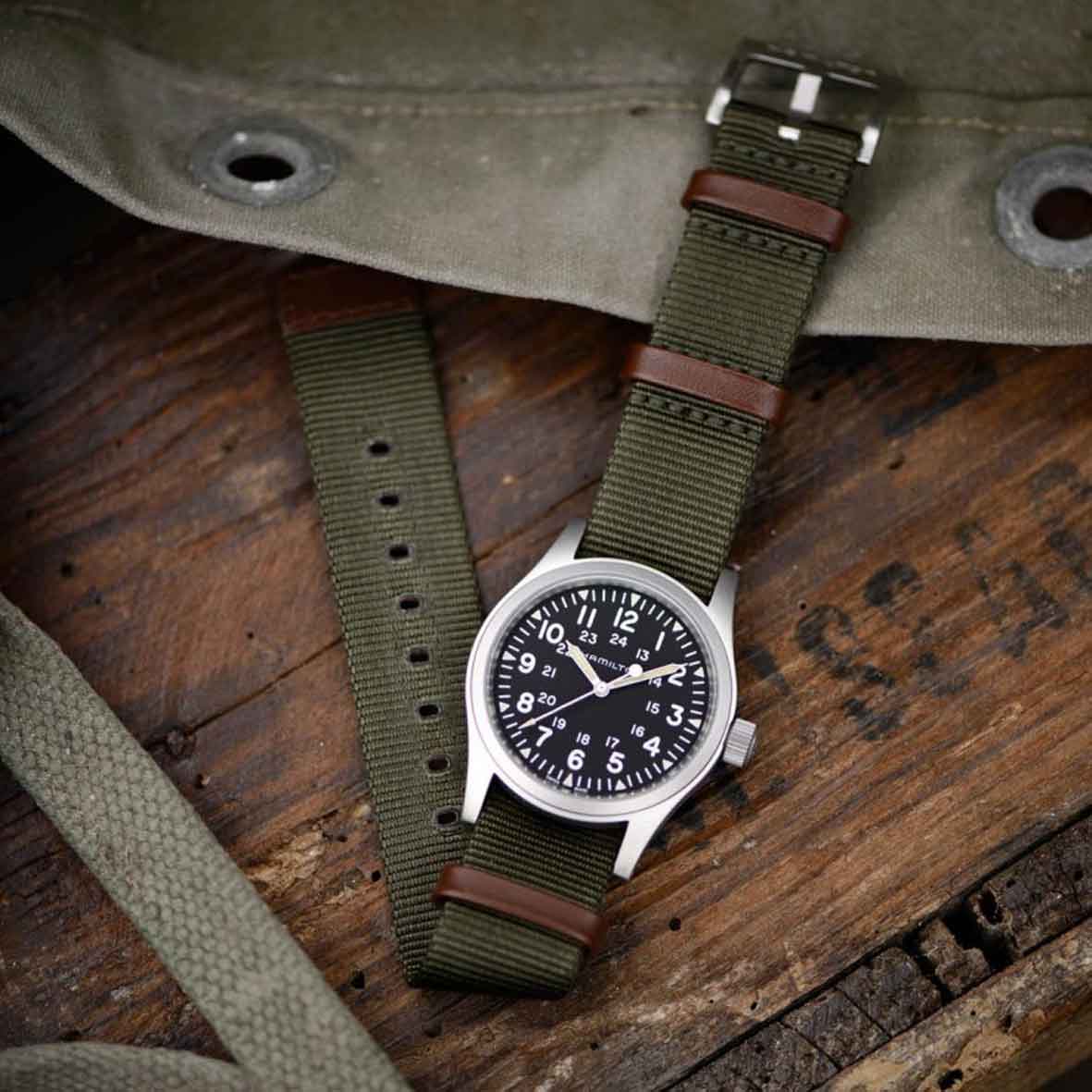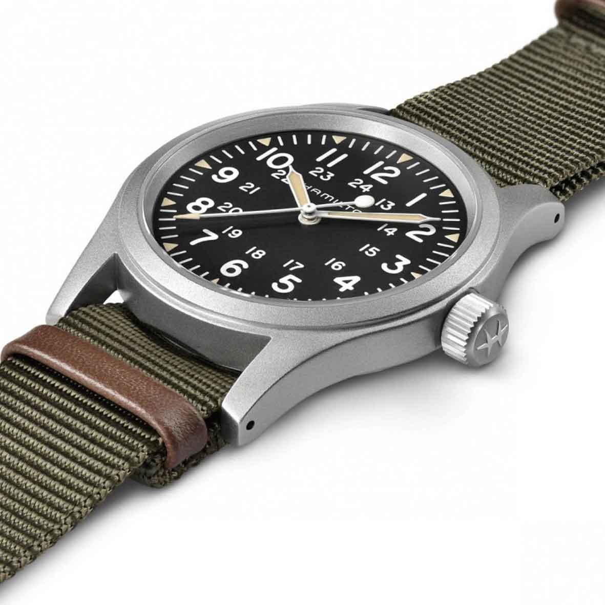 Boîtier en acier inoxydable de 38 mm, trois aiguilles, cadran sombre avec chiffres clairs, index triangulaires avec Super-LumiNova® radium vintage et bracelet NATO résistant : la nouvelle Khaki Field Mechanical est une fidèle reproduction de son ancêtre des années 60, véritable hommage à l’héritage militaire d’Hamilton. Le boîtier de cette montre militaire originale est désormais traité PVD « terre », une couleur propre à Hamilton.