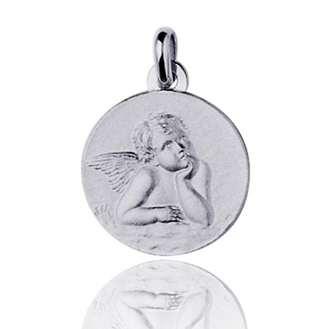 Médaille ange en or blanc 18 carats. Cette médaille traditionnelle ronde polie sablée représente l'ange Raphaël de face. La bélière ronde s'adapte à tous types de chaine.