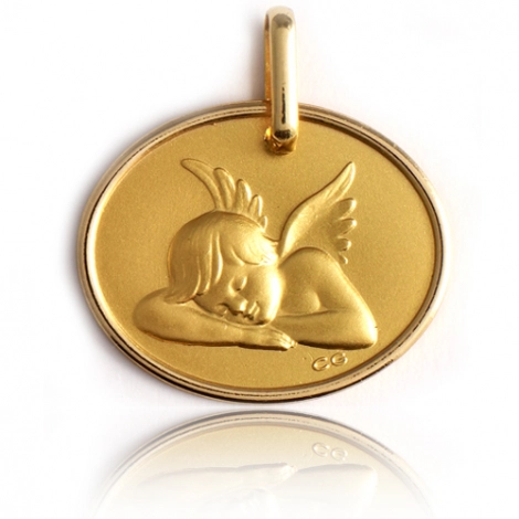 La médaille est de forme ovale avec le contour ourlé pour mettre le chérubin en valeur.