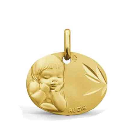 Cette médaille de forme ovale au fini satiné diamanté est en Or Jaune 9 carats.