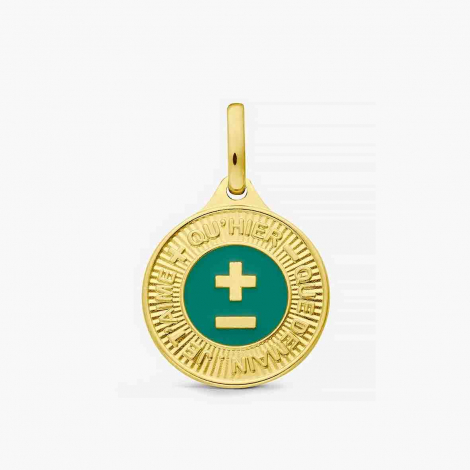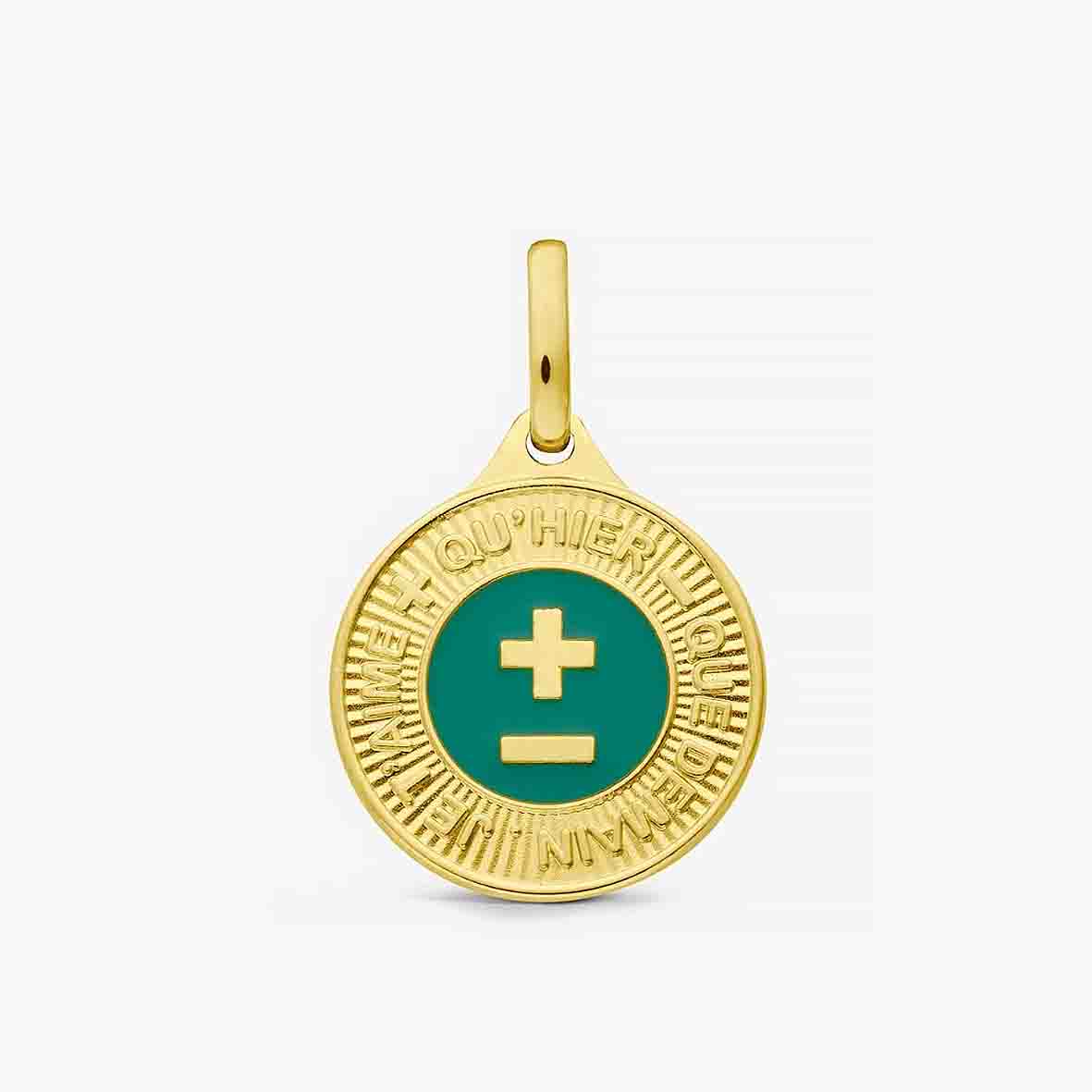 Façonnée en or jaune 18 carats, cette médaille de joaillerie fine arbore une finition polie brillante qui capte magnifiquement la lumière. La résine de couleur émeraude confère une touche contemporaine à ce classique intemporel, créant un contraste subtil avec le précieux métal doré.