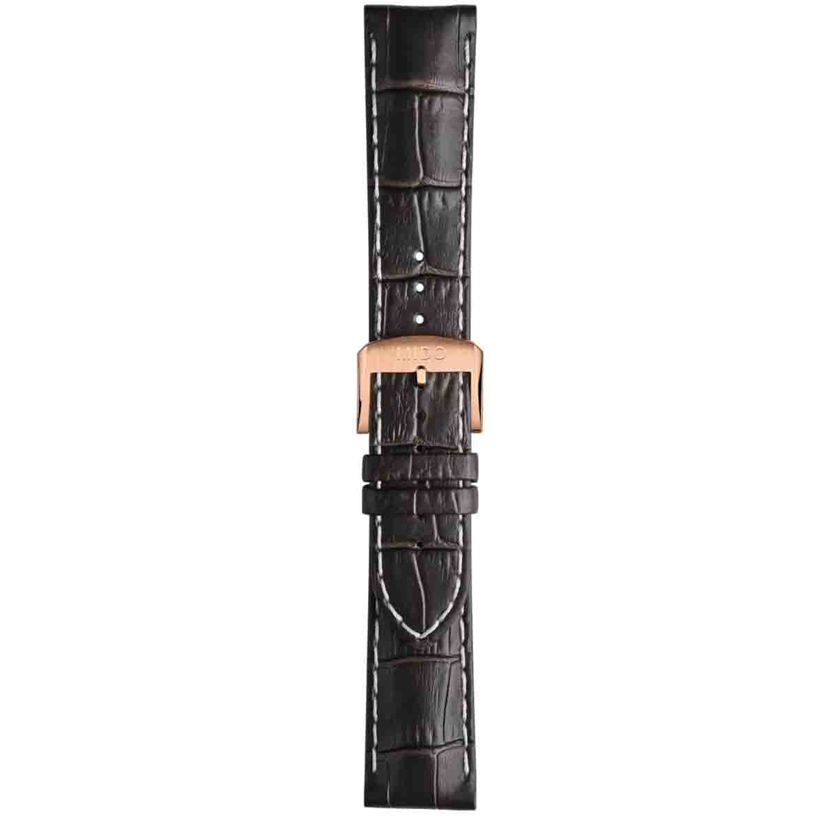 Avec son entre-cornes de 22mm et sa boucle ardillon dorée en or rose 5N, ce bracelet incarne le savoir-faire horloger de la maison Mido.La piqûre discrète en fil blanc ajoute une touche de raffinement qui souligne les détails de votre monnaie de poignet. Les dimensions généreuses de 120mm à 6h et 75mm à 12h offrent un ajustement optimal pour différentes morphologies.