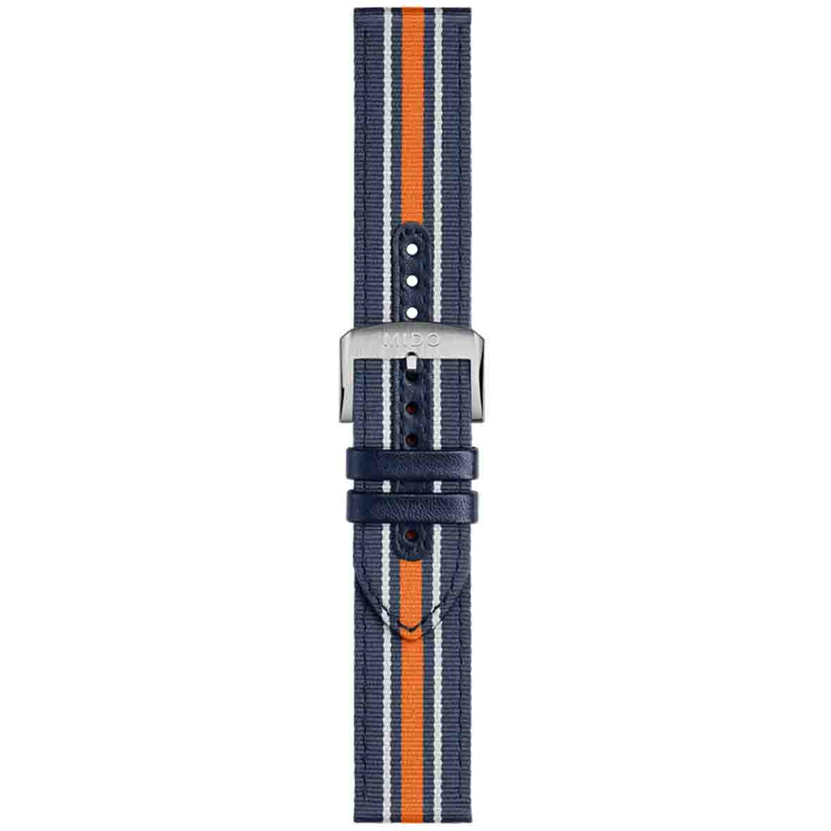 Découvrez le bracelet en tissu bleu et orange 22mm, la pièce indispensable pour transformer l'apparence de votre montre Mido.Conçu avec soin par la manufacture horlogère suisse, ce bracelet textile incarne l'alliance parfaite entre style contemporain et confort quotidien. Que vous cherchiez à ajouter une touche de couleur à votre Baroncelli, Multifort ou Ocean Star, ce bracelet Nato en tissu s'adapte parfaitement à vos envies.