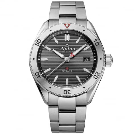 Cette montre Alpina est équipée des fonctions essentielles, notamment l'affichage des heures, des minutes et des secondes, ainsi qu'un guichet de date positionné à 3 heures.