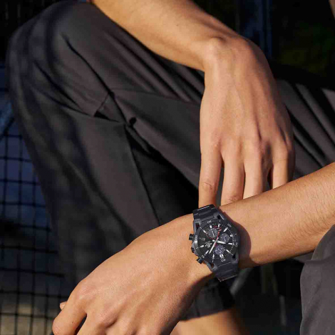 Ce chronographe à énergie solaire est doté d'un boîtier en résine renforcée de fibre de carbone, avec un bras de suspension, d'un cadran en fibre de carbone et d'un verre saphir, qui vous permettra d'affirmer votre style et votre sophistication.