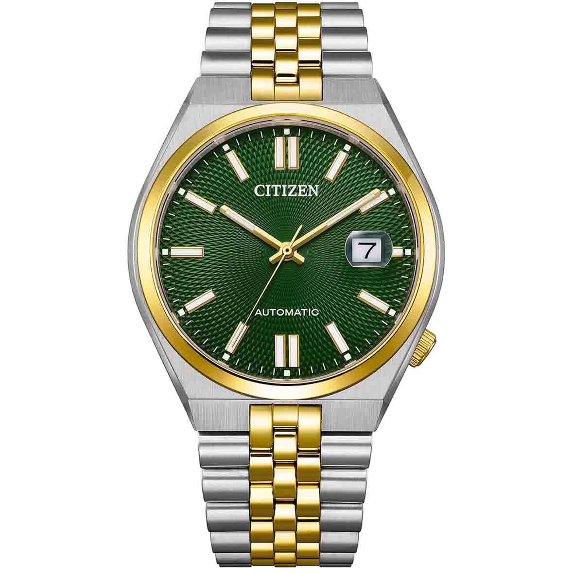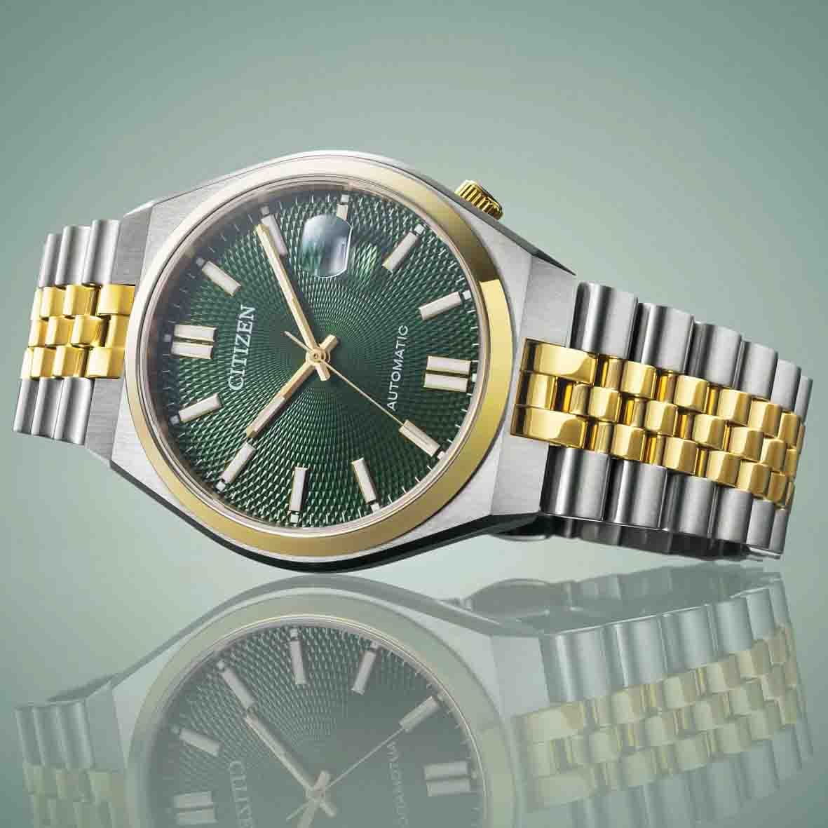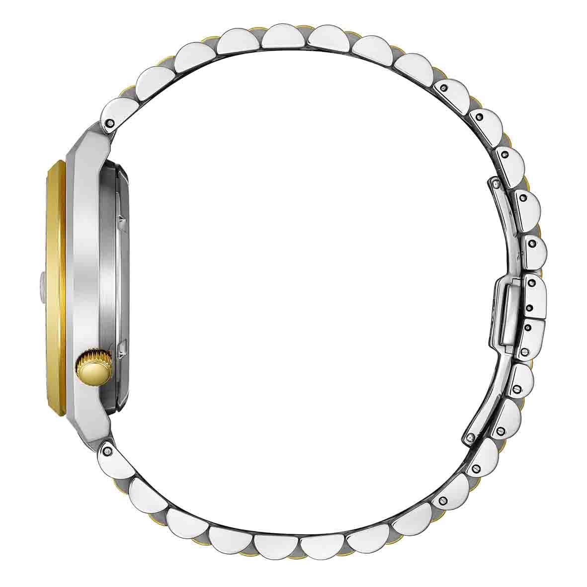 D’un diamètre de 40 mm, la conception polyvalente et raffinée de la montre fait forte impression avec son boîtier en acier inoxydable deux tons aux teintes argent et or et son bracelet à cinq maillons parfaitement intégré.