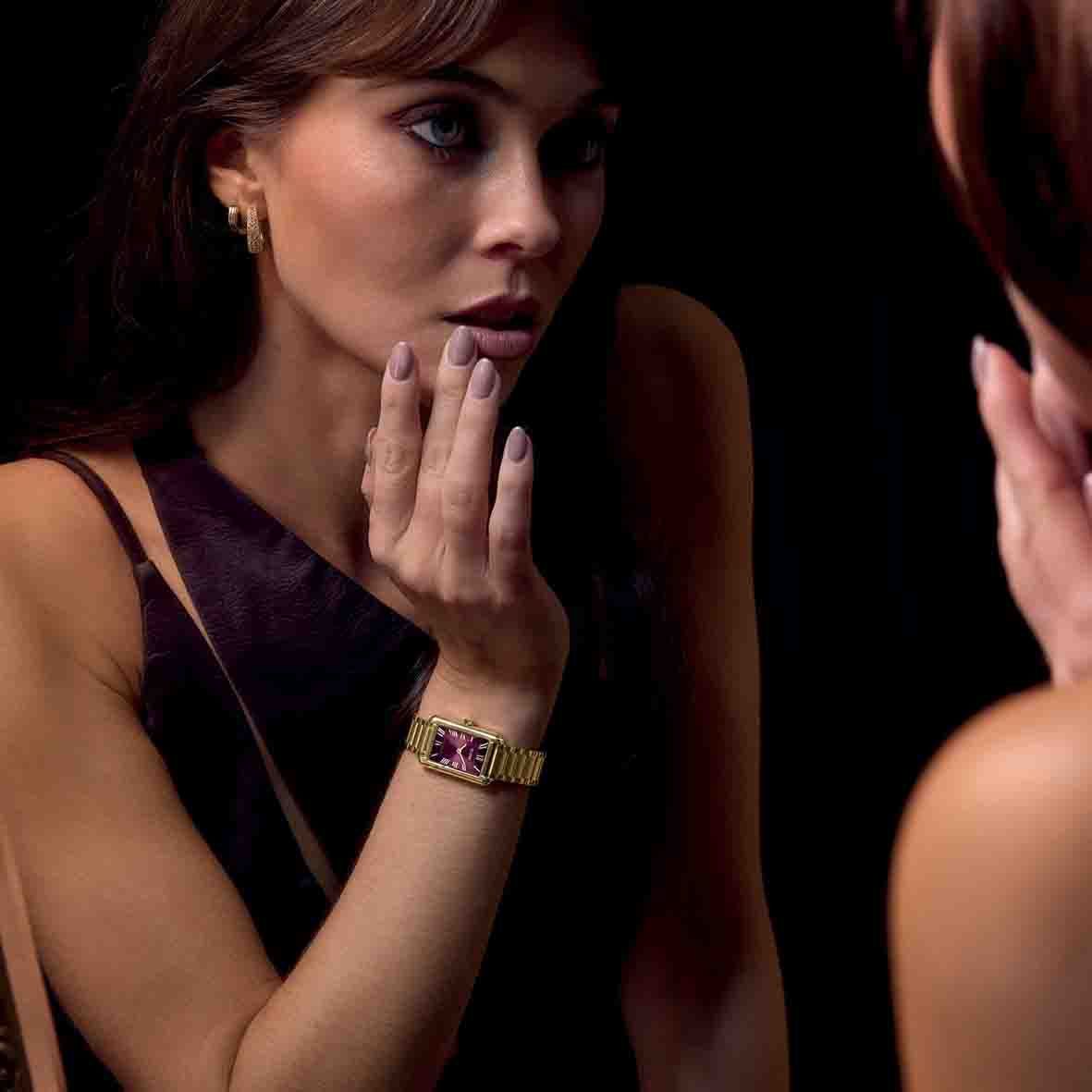 Le bracelet en acier PVD doré de 14 mm, d'une hauteur de boîtier de seulement 7.3 mm, épouse le poignet avec délicatesse et confort, rehaussant chaque tenue d'une touche de glamour subtil.