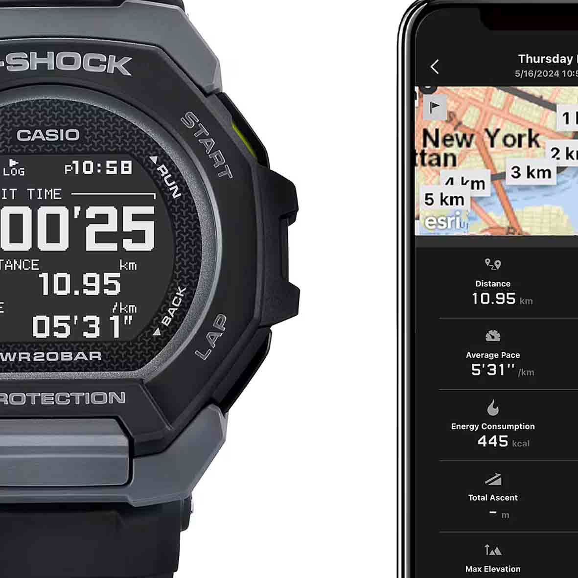 Affichant le profil le plus fin de la gamme G-SQUAD, cette montre est dotée d'une structure résistante aux chocs dans laquelle le boîtier en résine renforcée de fibre de verre est placé entre deux lunettes distinctes.