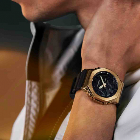 Optez pour le métal avec une G-SHOCK dans une combinaison de couleurs toujours aussi populaire : noir et or. La lunette en métal ionisé doré, posée sur une base noire, est un choix de design élégant.