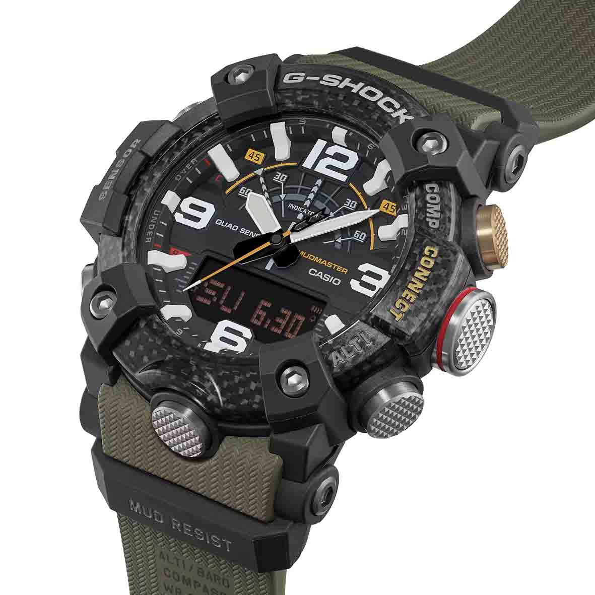 La structure Carbon Core Guard offre une protection inégalée contre les chocs, tandis que le filtre anti-infiltration et le fond de boîtier antichoc en résine renforcée de fibres de verre garantissent une étanchéité à 200 mètres (20 ATM). Le bracelet en résine bio kaki, équipé d'une boucle ardillon, assure un confort optimal pour les poignets des hommes actifs.