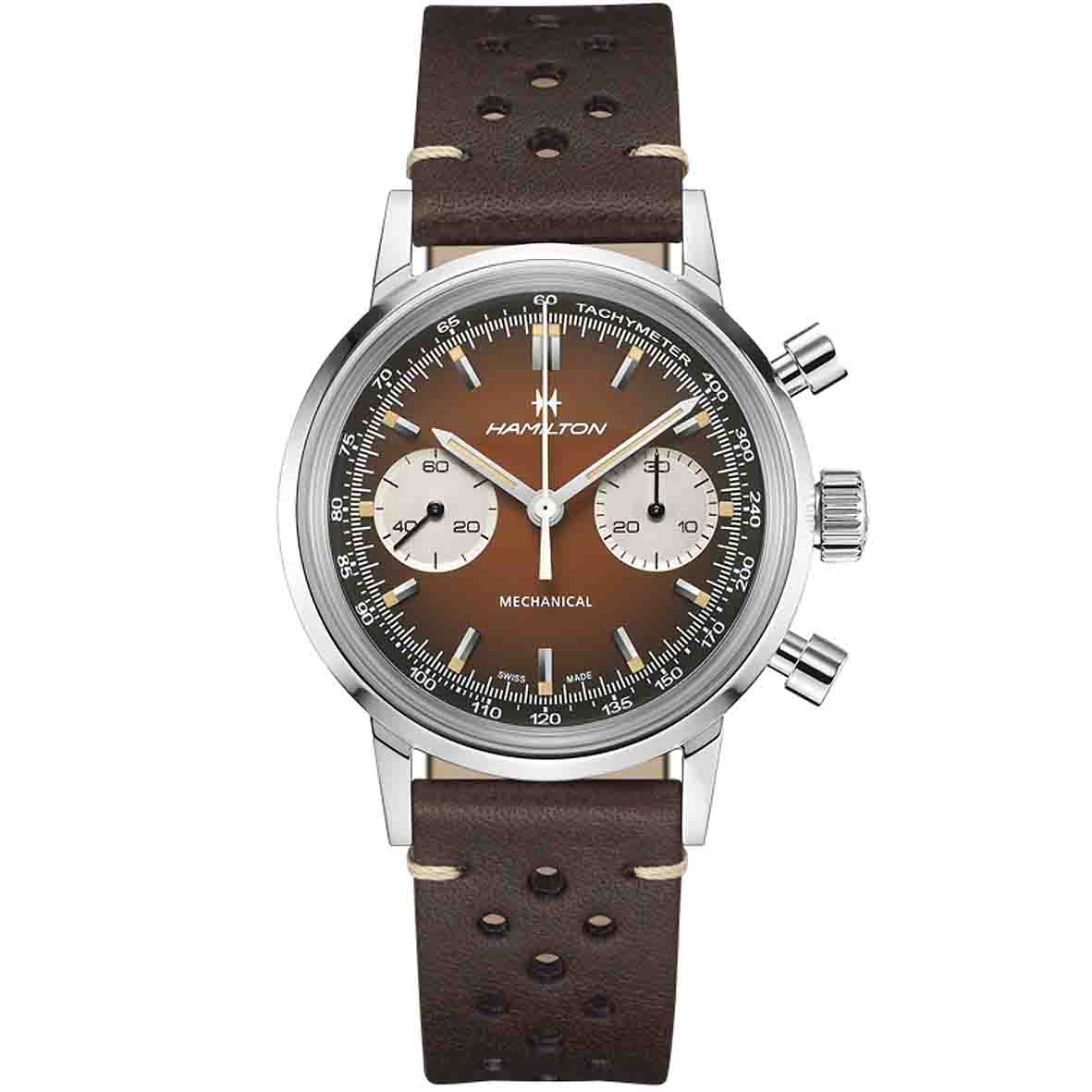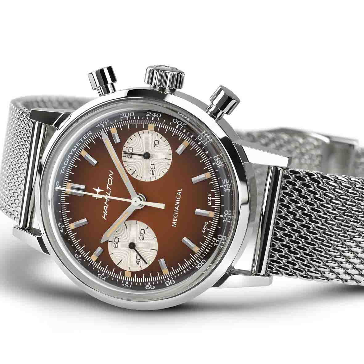 La Montre Hamilton American Classic Intra-Matic Chronograph puise son inspiration dans l’univers palpitant des courses automobiles des années 1970, capturant l’esprit de vitesse, d’aventure et le style intemporel de cette époque. Son cadran brun fumé et son bracelet perforé rendent hommage à cet héritage.