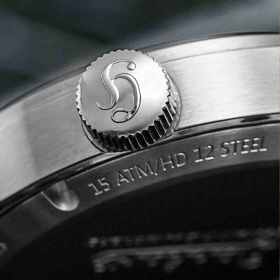 Son boîtier de 39 mm, fin (10,5 mm) et parfaitement proportionné, est réalisé en acier HD12™ durci, dont la surface atteint une dureté d’environ 1200 HV, largement supérieure à l’acier 316L traditionnel.