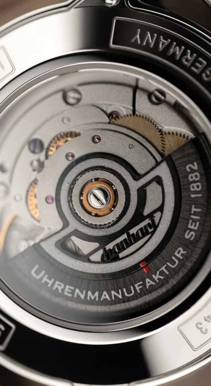 Le rotor squeletté, orné du logo Hanhart, souligne le haut niveau de savoir-faire et est visible à travers le fond saphir vissé.